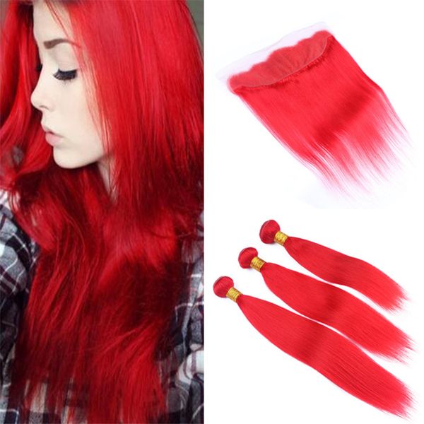 2020 Bright Red Human Hair 3 Bundles With Lace Frontal Closure